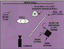 I used a doll's face as a controllable 3-D object and a suspended film reel to cast a shadow on a white wall. The light source (a Pepper 650, from LTM, Sun Valley, CA) was placed camera right, about five feet from the doll. The film reel (held by a C-stand) was positioned to throw a distance shadow behind the doll. Another C-stand held an 18" x 24" black flag close to the left of the doll to create a "negative bounce ." This kept unwanted ambient light from illuminating the shadow side of the face. A C-stand with its gobo arm at a 90° angle was positioned 28 inches in front of the Pepper. During the test, this made it very easy to slide different rolls of diffusion on and off the stand.