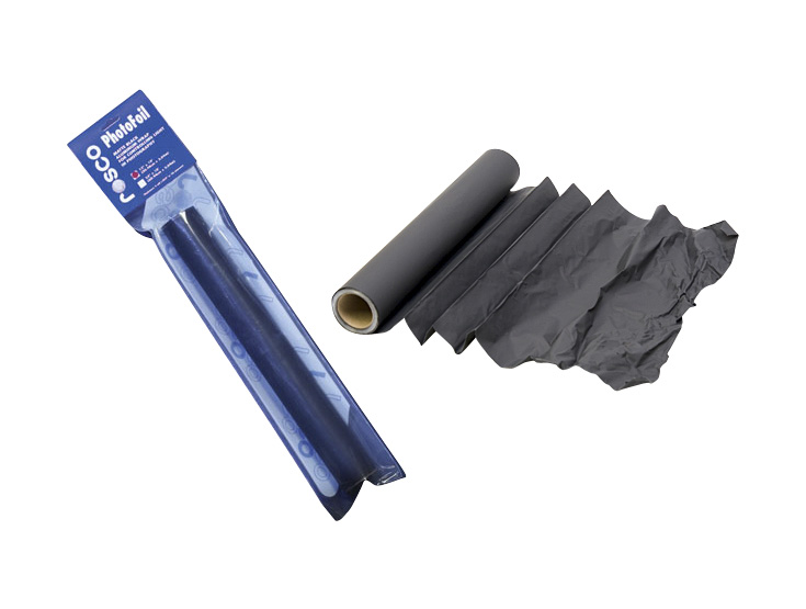 Blackwrap and Photofoil are made using a flexible .002-inch thick aluminum substrate that is form-holding and both heat and weather resistant. Featuring a matte black coating on both sides, these materials are ideal for masking light leaks and eliminating unwanted reflections. It can quickly be molded to form barndoors, snoots, flags and other light controlling configurations. Lightweight, yet durable, this material can easily be positioned in place with tape, staples or adhesives.