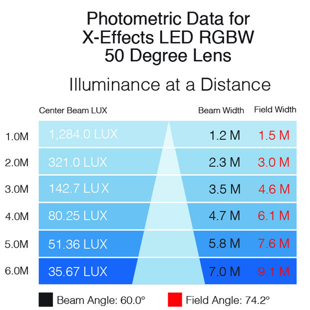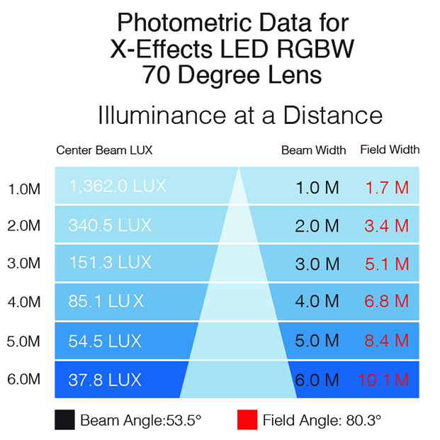 X-Effects LED プロジェクターにはレンズは付属していませんのでご注意ください。プロジェクトの要件に合ったビームの広がりが達成できるよう、注文時に必ずレンズアクセサリを選択してください。レンズオプションの例:19°、30°、50°、70°。詳細については下の光度測定をご覧ください。